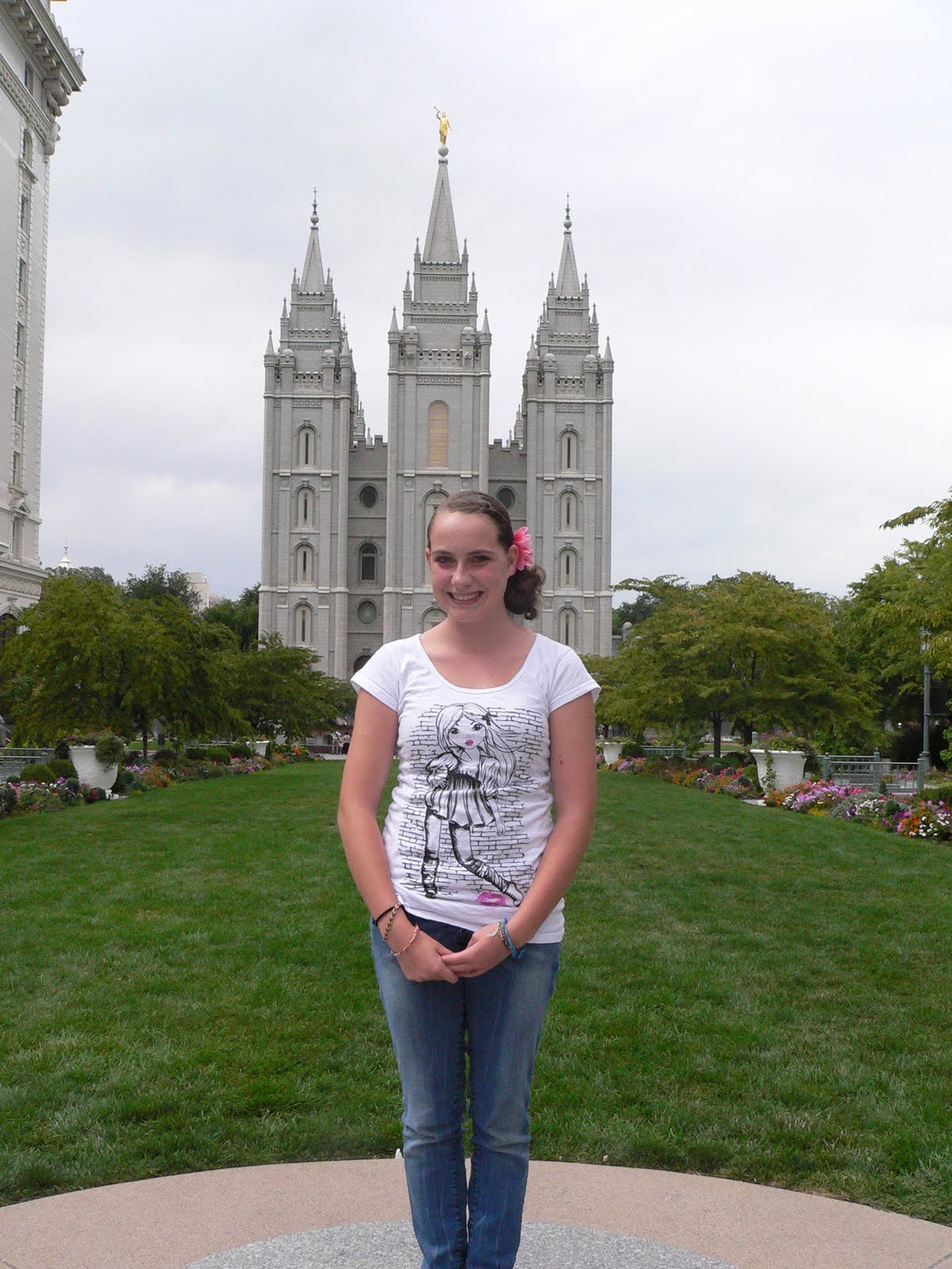 We went to the top of the Joseph Smith building before we took Hanna to see the Joseph Smith movie in the legacy theater about the life of our beloved prophet, if you haven't seen this yet it is AMAZING and you really should order it or get a copy from the distribution center. Anyways Hanna is scared of heights but she got close enough for a picture.